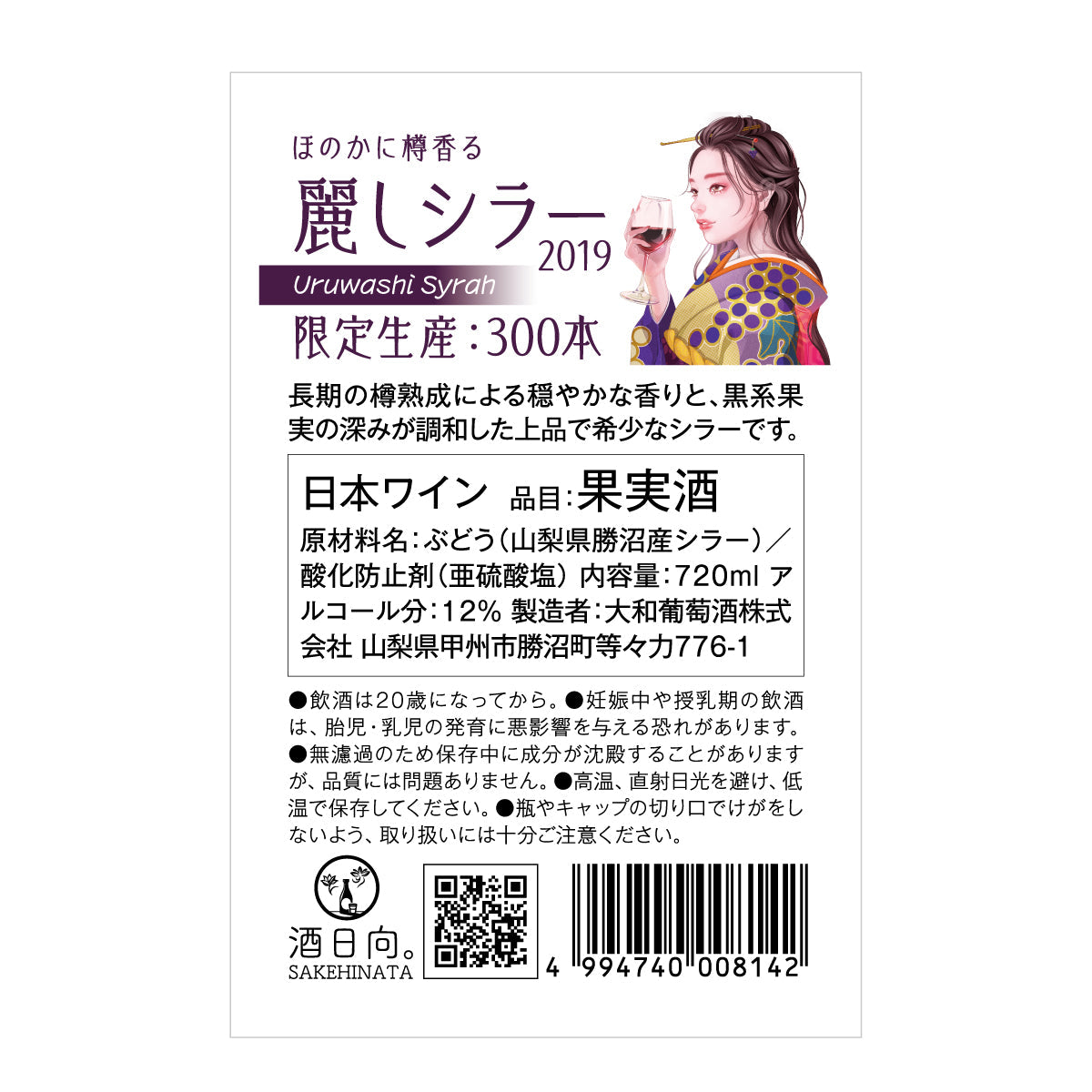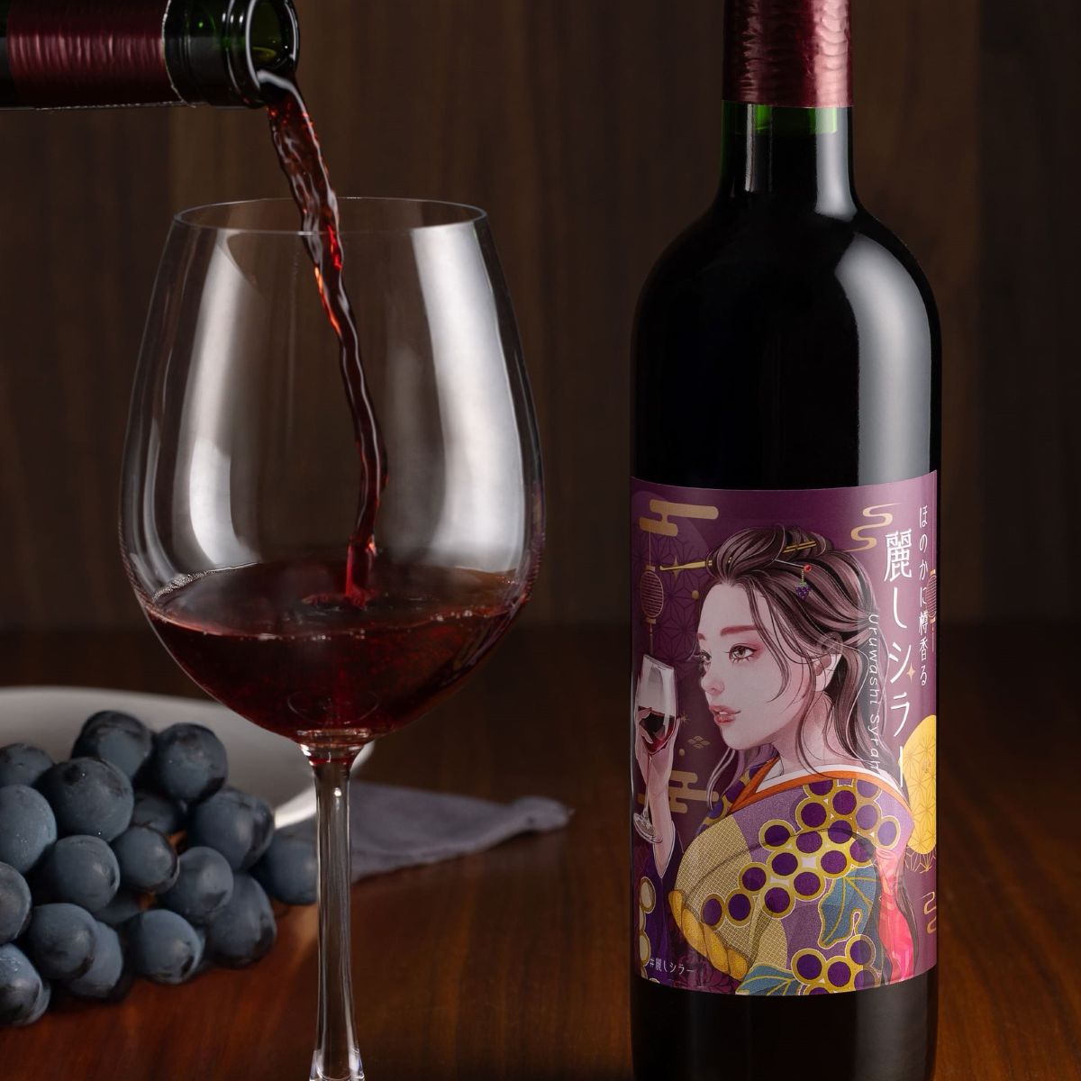 ワインの味わいをイメージした美しいイラストは、人物が浮き上がるような特別な印刷が施されています。ぶどう柄の着物を纏った麗しい女性の姿を眺めながら、麗しシラー をお楽しみください。