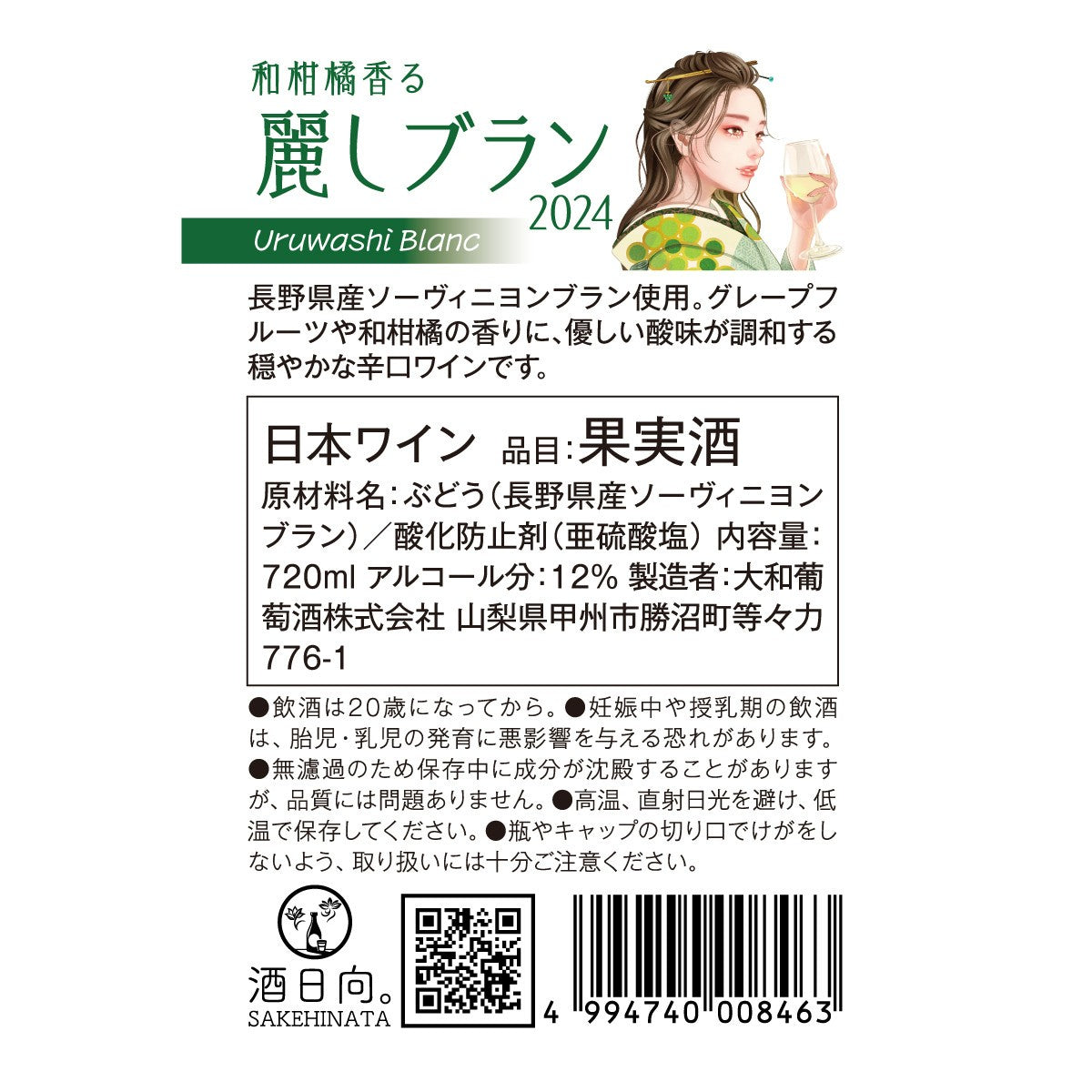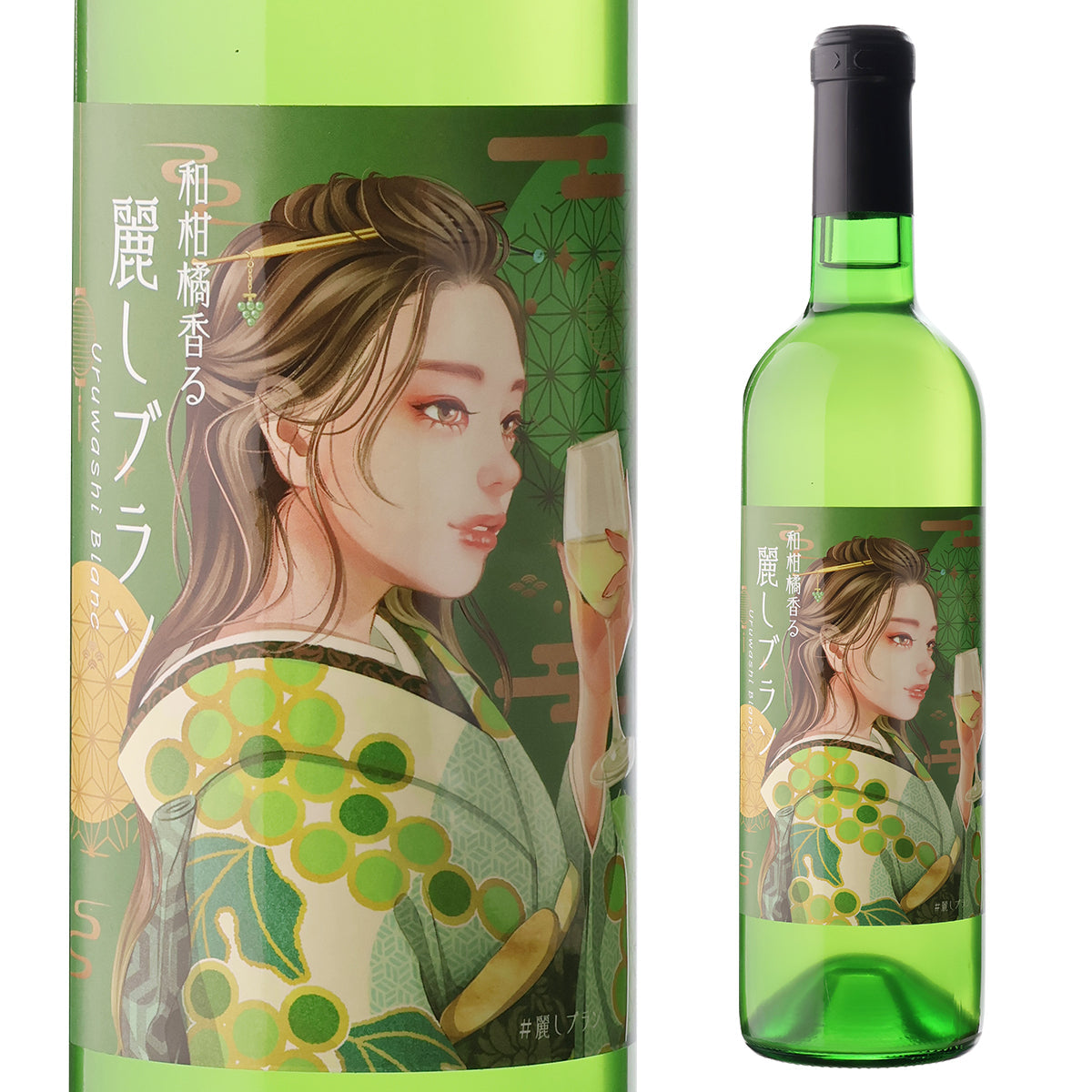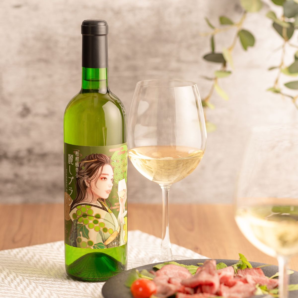 ワインの味わいをイメージした美しいイラストは、人物が浮き上がるような特別な印刷が施されています。ぶどう柄の着物を纏った麗しい女性の姿を眺めながら、麗しブランをお楽しみください。