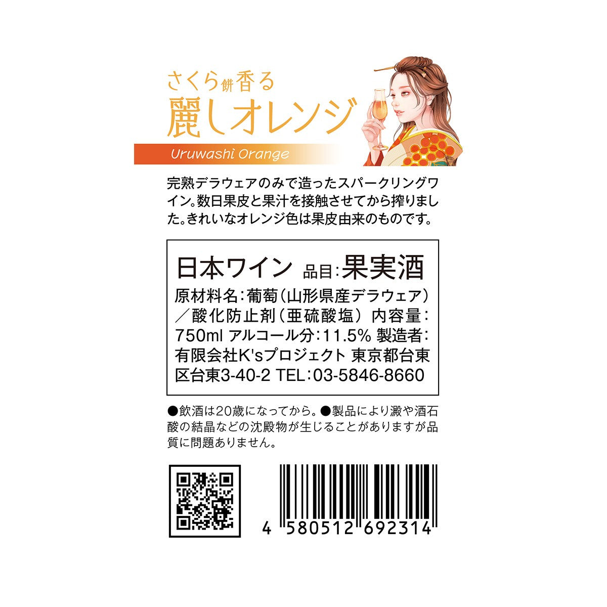 白ワイン用ブドウ品種を赤ワインのように果皮や種子ごと醸造させるオレンジワイン。白ワインにはない旨みや苦み、複雑みがワインに加わり、個性的でファンキーな印象を持たれがちですが、この麗しオレンジは優美でエレガントなスタイルです。ブドウは“フルーツ王国”山形県産のデラウェアを使用しています。透き通るようなオレンジ色に、温州みかんやブラッドオレンジを思わせるアロマ、そしてほのかな桜の花のニュアンスが漂います。華やかな香りとは対象に味わいはドライ、和食はもちろん、お肉や中華、エスニック料理とも好相性です。